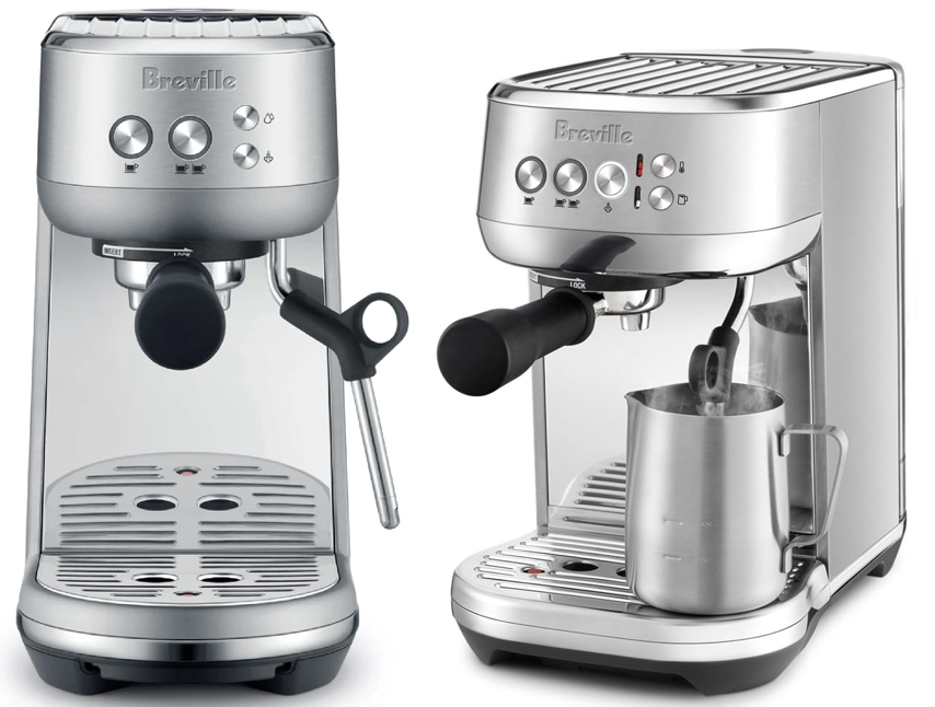 The Breville Bambino (BES450) retails for $300 and is frequently on sale for $250 or less. The Breville Bambino Plus (BES500) retails for $500 and is sometimes found for $400. The price gap is roughly $150–$200 depending on sales.