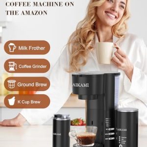 • 4 IN 1 Single Serve Coffee Maker with Milk Frother and Coffee Grinder, Coffee Maker for K Cup and Ground Coffee, with 30 oz Removable Water Reservoir, 6 to 14 oz. Brew Sizes, Coffee Machine for Home