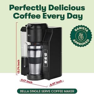 Bella Single Serve Coffee Maker, Dual Brew, K-cup Compatible - Ground Coffee Brewer with Removable Water Tank & Adjustable Drip Tray, Perfect for Travel Mug, 1200 watts, Black