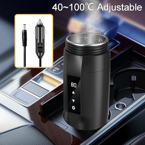 【PORTABLE & TEMPERATURE ADJUSTABLE】- Tuehakny car kettle is small and lightweight,with the functions of boiling water and keeping warm(Need Plug in).The 12V 80W mini electric kettle keeping warm function can set the temperature range within 40~100℃ by ▲ or ▼.Meets your needs for coffee,tea,milk and more.12V heated travel mug is designed for in-car use,so you can greatly enhance your sense of happiness in the car.