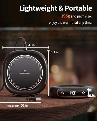 【PORTABLE and Easy to Clean】 Our coffee cup heater features a 1.3m (51-inch) power cord, weighs just 7 ounces, and is only 0.9 inches thick, making it easy to use anywhere. Constructed from durable ABS and aluminum alloy with an upgraded metal heating plate, it heats up quickly and is easy to clean. Additionally, it operates quietly, ensuring a peaceful environment.