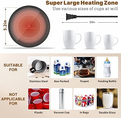 Waterproof Design: This coffee warmer for desk comes with a waterproof conductive glass surface, so there is no need to worry about the safety of occasional spills, it is safe and easy to clean. 5.2″ oversized heating area can warm up coffee faster and evenly, just enjoy fragrant coffee without waiting