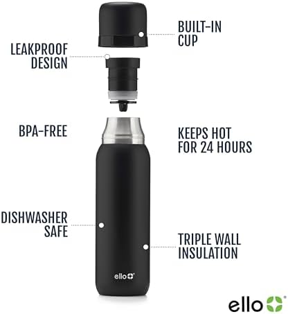 The Ello Therma 32oz triple vacuum insulated stainless steel thermos has all the features you need to embark on your adventures.The top lid isn’t just a lid—it’s also a convenient cup! Unscrew the cap to use it as a mug, perfect for enjoying everything from hot tea and coffee to your favorite wine, making it a versatile choice for any beverage. The leak-proof, slider lid allows you to enjoy your drinks directly from the thermos or pour them into the integrated 7.7oz cup. Hot beverages stay warm up to 24 hours, while cold drinks remain chilled for 30 hours, thanks to its robust triple-wall insulation reinforced by a copper lining, this durable thermos is your ultimate companion for a lifetime of exploration. All parts top rack dishwasher safe and BPA-free.
