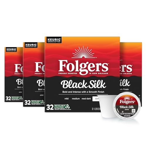 Contains four (4) thirty-two (32) count boxes of Folgers Black Silk Keurig K-Cup Pods