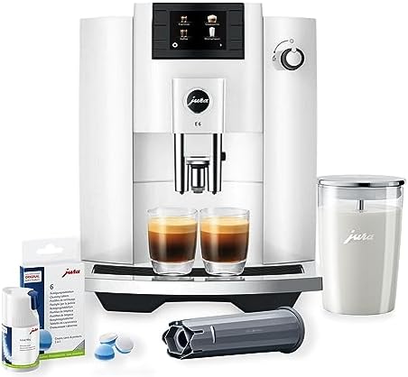 Bundle Includes: Jura 15559 E6 Automatic Espresso Machine with Easy Cappuccino Function and Preheating (Piano White), Jura Glass Milk Container, Jura Phosphate-Free Milk System Cleaner Mini-Tabs with Dispenser (90g Bottle, Off-White), Jura CLEARYL Smart+ Filter Cartridge Water Stabilizer with RFID Technology and TÜV-Certified Hygiene, and Jura 3-Phase 6 Cleaning Tablets