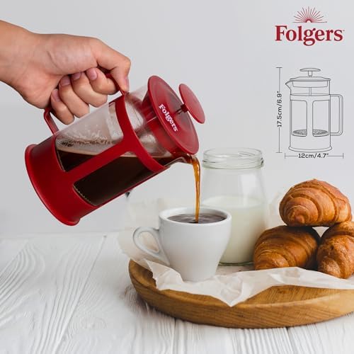Brew your coffee the Folgers way with this official Folgers Coffee French Press. Designed with a heat-resistant thickened glass carafe and a durable red frame, this French press captures the bold and smooth taste that coffee enthusiasts love. The stainless steel filter locks in flavor while keeping grounds out of your cup, ensuring every sip is rich and satisfying. With a 600ml (20 oz) capacity, it’s perfect for morning rituals, sharing with a friend, or brewing multiple cups throughout the day. Whether you’re enjoying a quiet morning at home, working in the office, or entertaining guests, the Folgers French Press is a simple and stylish way to elevate your coffee experience. Make every cup a Folgers moment.