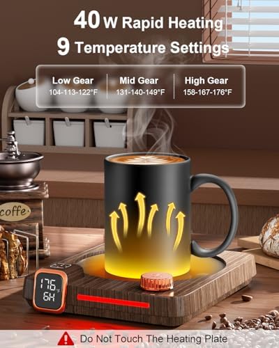 9 temperature settings: The 40W coffee cup warmer heats up faster and more steadily, with a dial that easily adjusts 9 temperatures ranging from 104°F to 176°F, keeping your coffee or beverage at the desired temperature.
