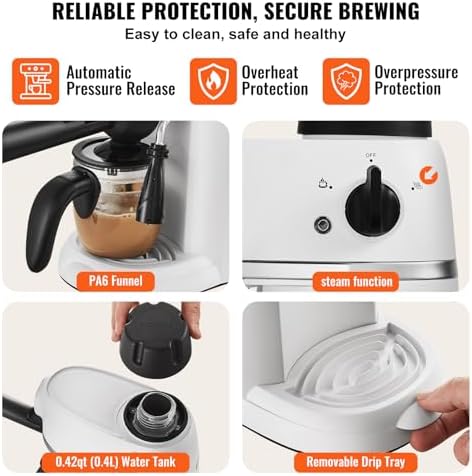 SAFE AND THOUGHTFUL DESIGNS — High safety is prioritized with our automatic pressure release, overheat and overpressure protection. 0.42qt / 0.4L large capacity water tank spare you the need for frequent refills ; top cup warming holder preheats cups and glasses, while the detachable water drip tray makes cleaning effortless.